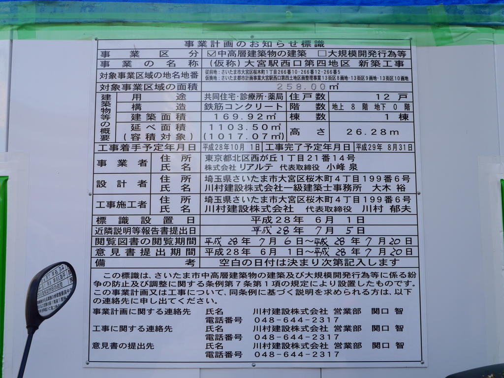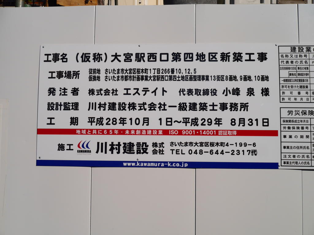 住宅12戸、診療所、薬局が入るようです件名 (仮称)大宮駅西口第四地区新築工事地名地番 埼玉県さいたま市大宮区桜木町1-266-10ほか(従前地)住居表示 埼玉県さいたま市大宮区桜木町1主要用途 共同住宅、診療所、店舗(薬局)工事種別 新築構造 鉄筋コンクリート造基礎階数(地上) 8 階階数(地下) 階延床面積 1103.5 ㎡建築面積 169.92 ㎡敷地面積 259.52 ㎡建築主 株式会社リアルテ建築主住所設計者 川村建設株式会社一級建築士事務所設計者住所施工者 川村建設株式会社施工者住所着工 2016/10/01完成 2017/08/31備考 共同住宅(12戸)、診療所、店舗