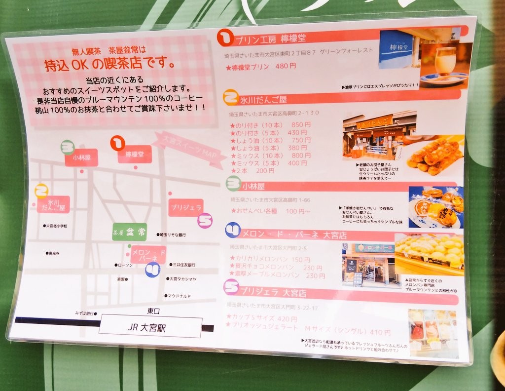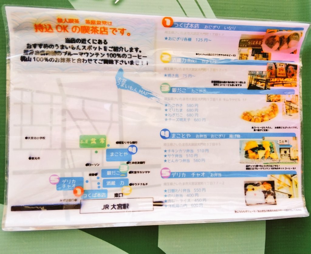 飲食物持ち込みOKとのことで、お店の前にはおすすめの飲食店が貼られています
