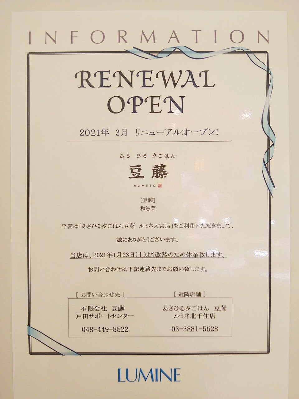 大宮ルミネ2 西口1階の あさひる夕ごはん「豆藤」が2021年3月リニューアル!