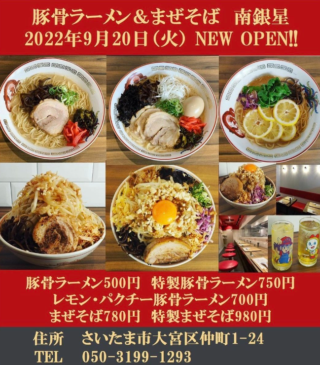 大宮駅東口南銀通りに豚骨ラーメン&まぜそば「南銀星」が2022年9月20日(火)オープン。