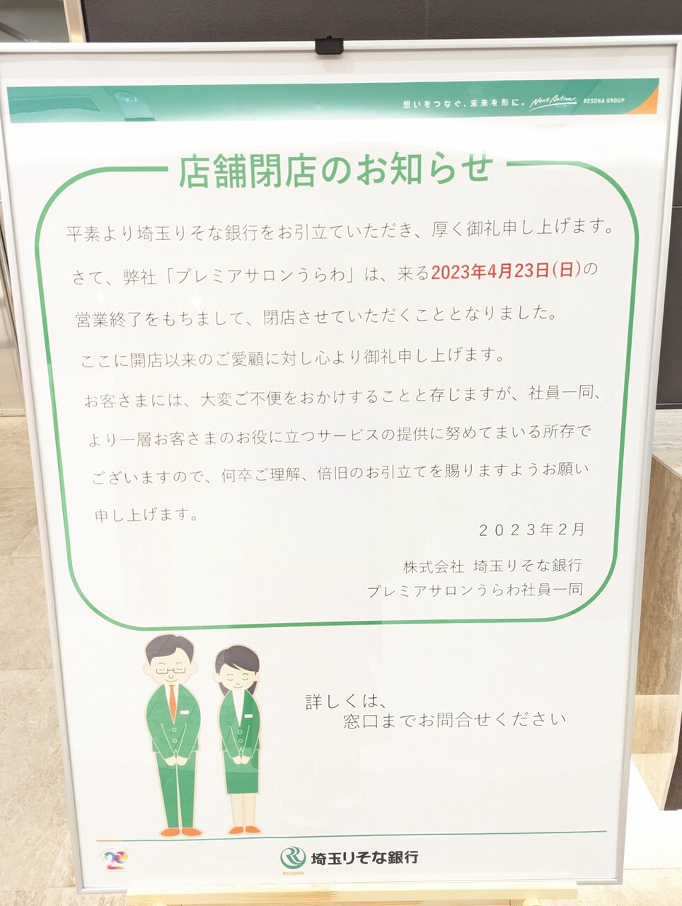 アトレ浦和4階の埼玉りそな銀行プレミアムサロンうらわが4/23(日)閉店 March 25, 2023 21:45 TOP> 閉店 > 浦和> mixiチェック 編集 アトレ浦和 WEST Area 4階の埼玉りそな銀行 プレミアムサロンうらわが2023/4/23(日)閉店です。アトレ浦和の西口側といえばレストランと、ジムのビルになっていますよね。4階(地上3階)はレストラン街の上のフロア。そこまで人の出入りはない印象でした。なおアトレ浦和の4階は「メディカルスクエア」として医療フロアになることがわかっています。 mixiチェック 編集 「新店・閉店」カテゴリの最新記事 「浦和」カテゴリの最新記事 < 前の記事次の記事 > コメント コメントフォーム 名前 コメント 評価する リセット リセット 顔 星 投稿する 情報を記憶