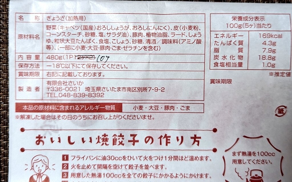 作り方は冷凍のままフライパンに並べて、沸騰したお湯を餃子にまわしかけて蓋をして5~6分蒸し焼きです。