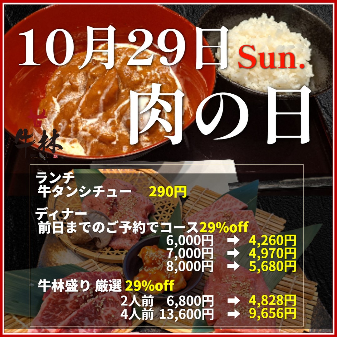 浦和の焼肉牛林では毎月29日は肉の日!ということで毎月イベントを行っています。