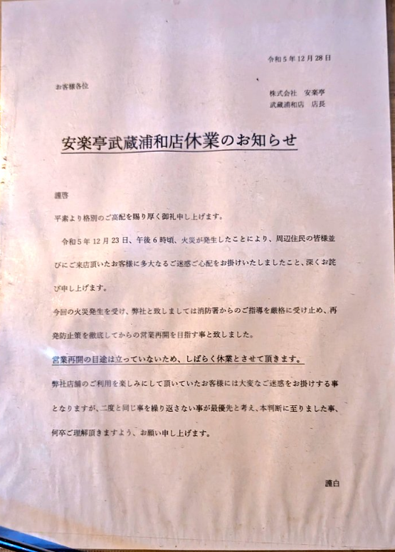安楽亭武蔵浦和店は2023/12/23に火災が発生し、以来再開を目指しながら休業という形をとっていました。