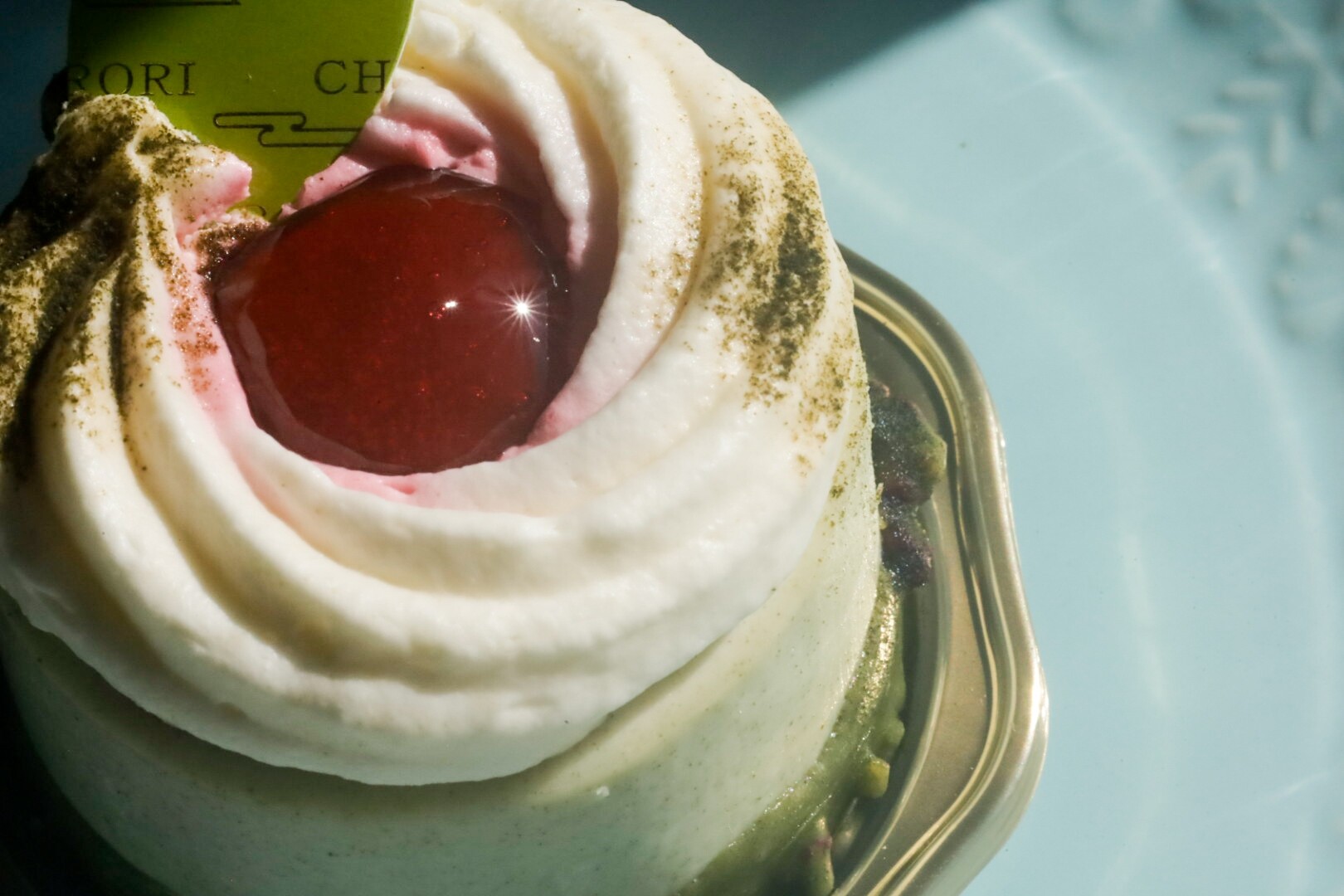 たっぷりのイチゴと狭山茶の抹茶が鮮やか!中はマスカルポーネとカスタードのクリーム。ワンハンドでキュートな一品✨️