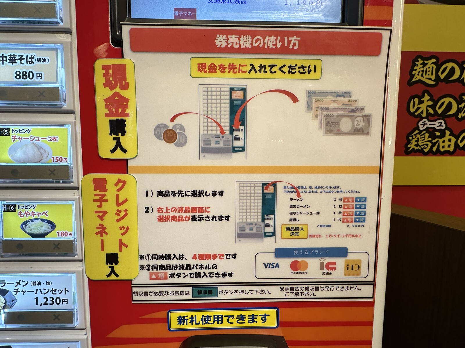 メニューのオーダー方法は食券機で、クレジットカードのタッチ決済にも対応していますが 使えるブランドはVISAとマスターカードで、JCBは使用できない点に注意が必要です。