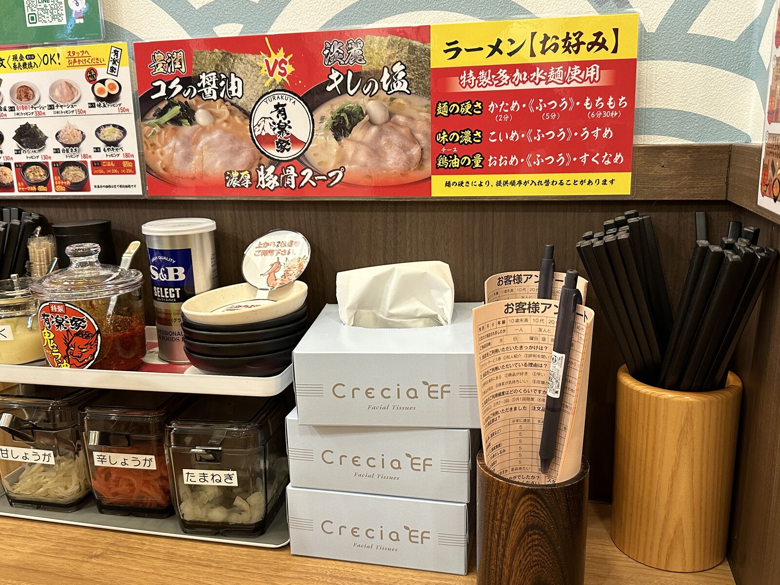 またテーブルをくっつければ4人がけ席も作れますが、やはりここはラーメン屋なのでファミレスのような家族向けの手厚いサービスまでは期待せず、奇跡的に空いていて席をくっつけられたら超ラッキーくらいの感覚が良いかと思います。