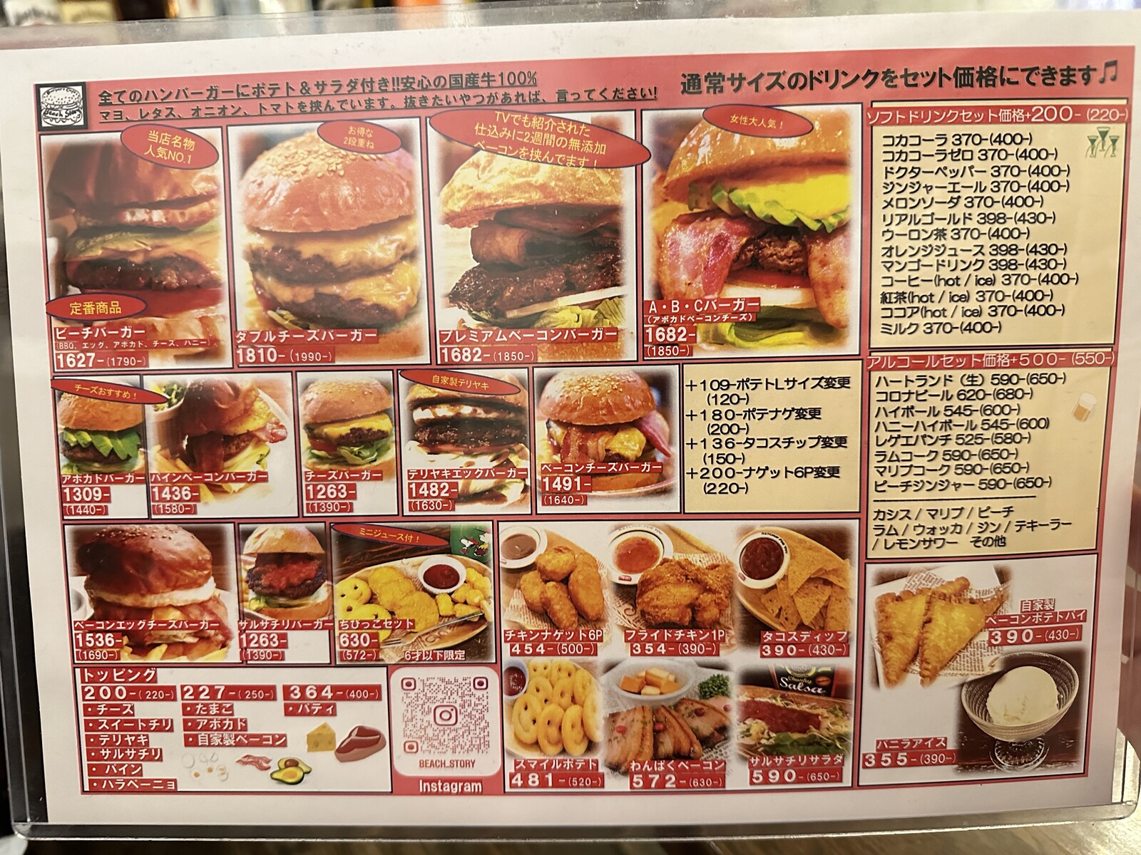 すべてのハンバーガーにはポテトとサラダが付いてくるのも嬉しいポイント。価格は1,500円~2,000円程度で、手作りの本格ハンバーガーを楽しめるコスパの良さも魅力です。