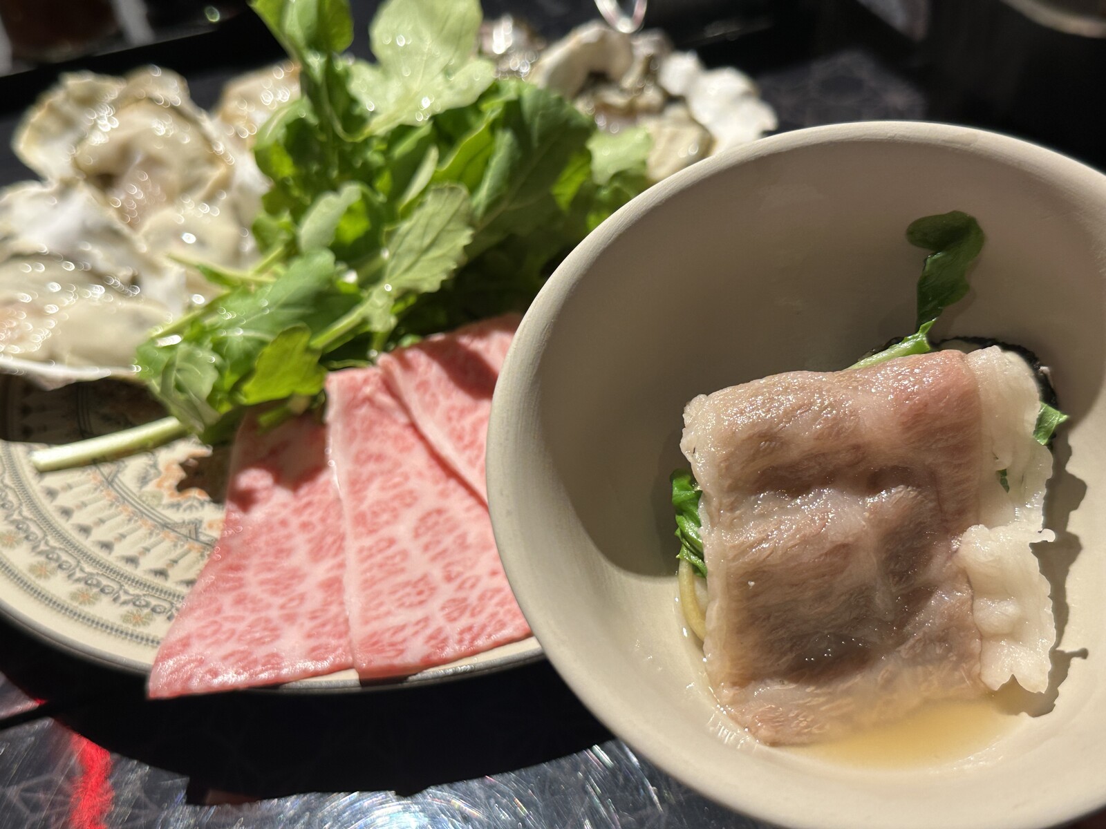 注目は「生牡蠣とA5和牛の黄金ウニ出汁しゃぶしゃぶ」で、生牡蠣を薄切りの豚肉で巻いて、ウニたっぷりの黄金だしでいただく至高のしゃぶしゃぶです。このメニューは4,840円(税込)と、特別な日に堪能したい一品となっています。