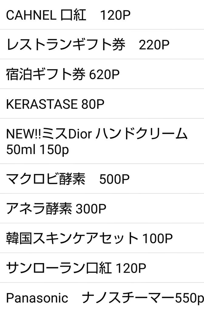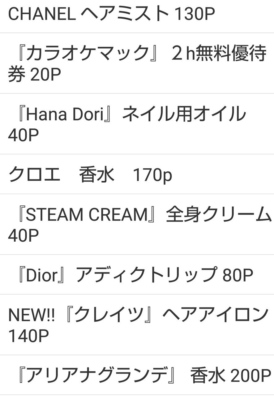 主な商品は香水、化粧品(ほぼMAC)、リップ、クリーム、レストランギフト券、宿泊券などです