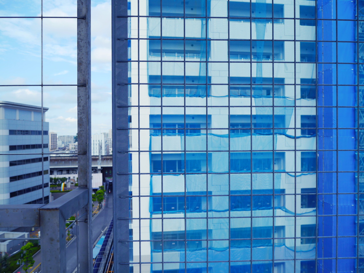 D棟は青い布も剥がされバルコニーにはSKYが映り込んでいます
