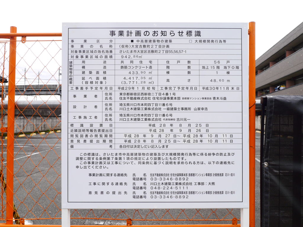 件名 (仮称)大宮吉敷町2丁目計画住居表示 埼玉県さいたま市大宮区吉敷町2主要用途 共同住宅工事種別 新築構造 鉄筋コンクリート造階数(地上) 15 階延床面積 4417.35 ㎡建築面積 433.9 ㎡敷地面積 942.86 ㎡建築主 住友不動産株式会社施工者 川口土木建築工業株式会社着工 2017/01/01完成 2018/11/30備考 共同住宅(56戸)