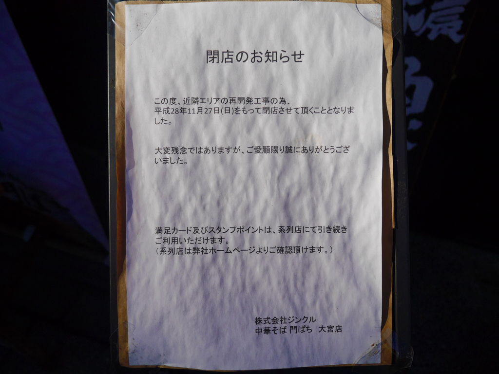 大宮駅東口のラーメン屋門ぱちが再開発のため2016年11/27に惜しまれつつ閉店します