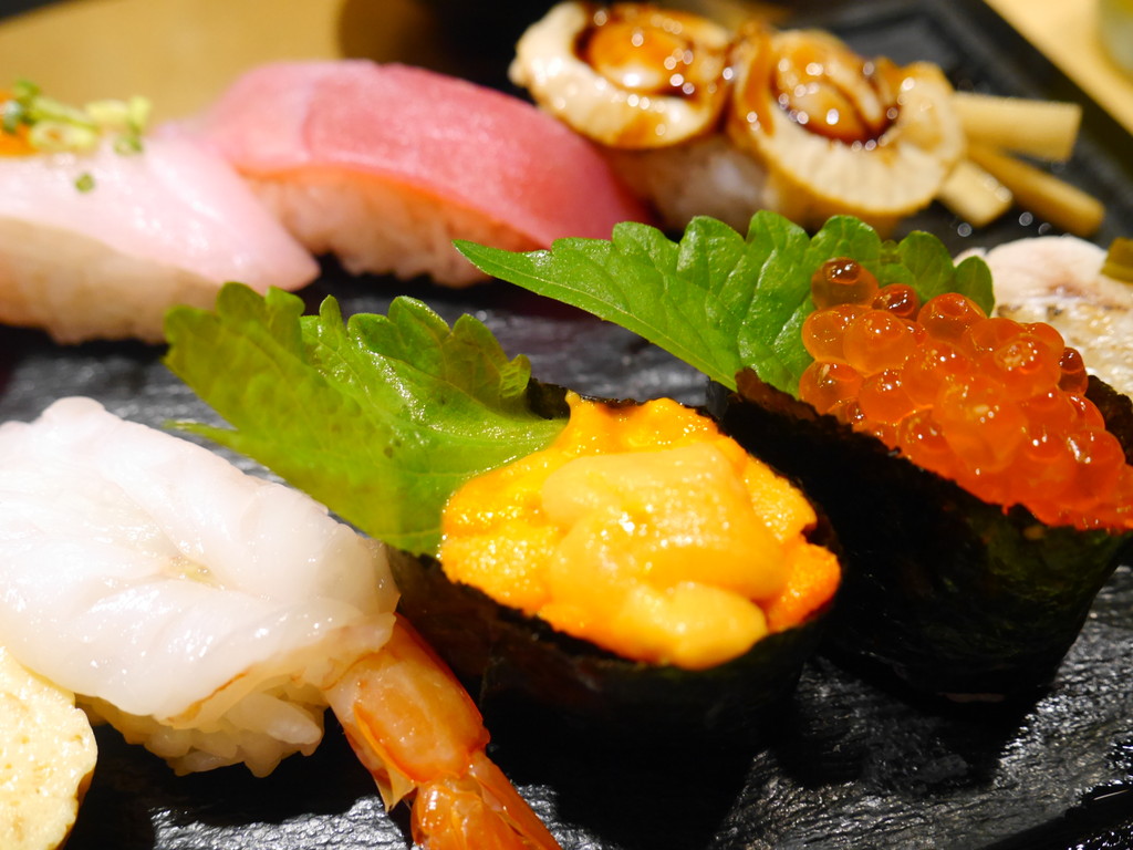 たまご、エビ、ウニ、いくら、さば?、中トロ、白身魚、まぐろ、ホタテ、巻物のセットでした!