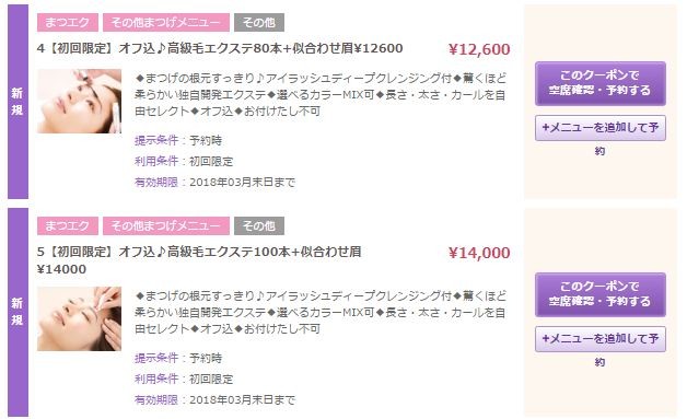 まつげエクステは80本~100本までのクーポンがあり、価格は9000円~14000円でした