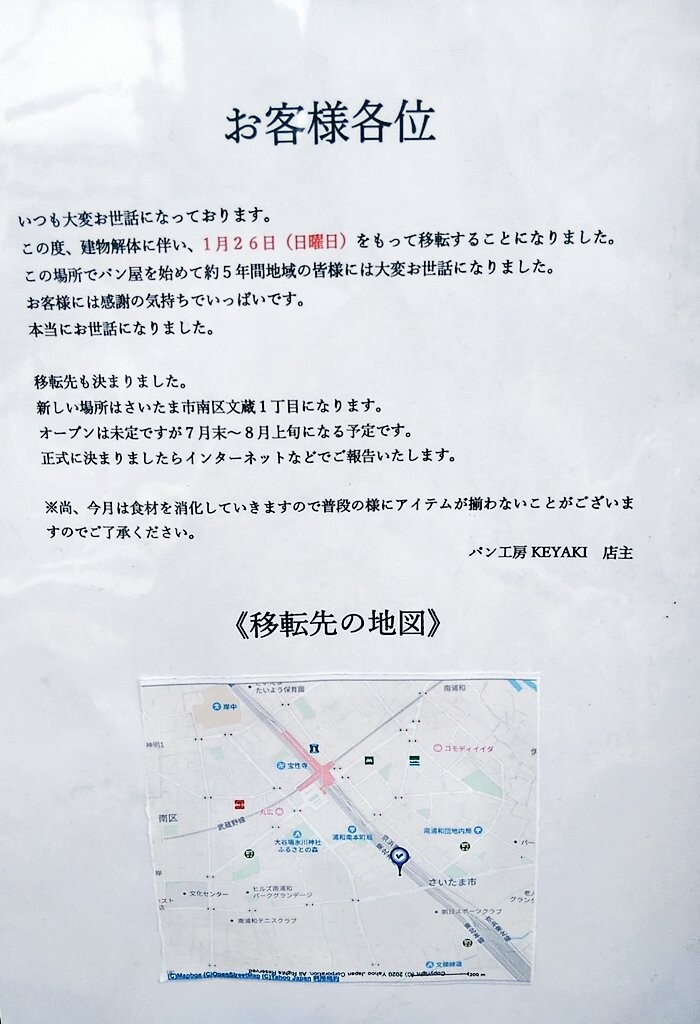 南浦和の文化センター、南浦和図書館の前にあるパン工房ケヤキが2020年1月26日をもって移転です