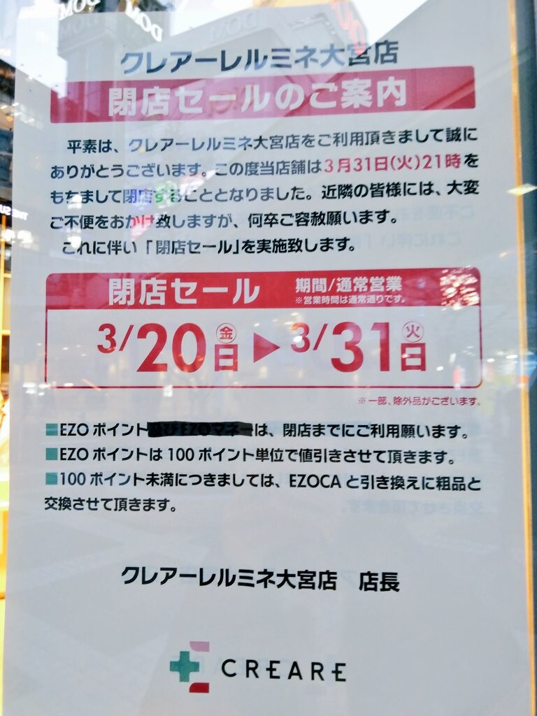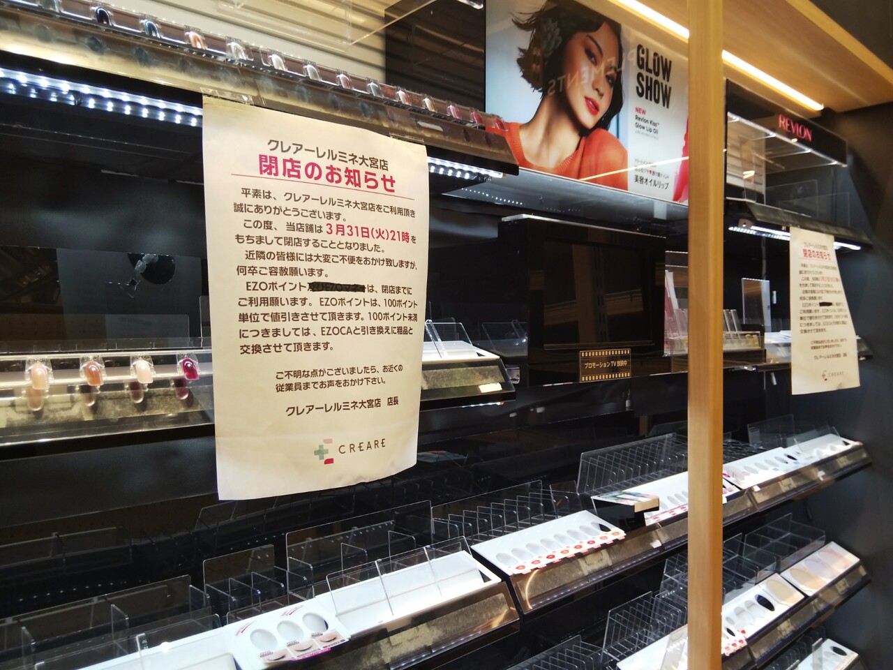 クレアーレルミネ大宮が2020/3/31で閉店です。