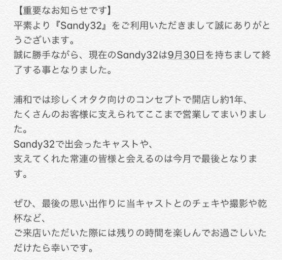 浦和のコスプレバー「Sandy32」が2020年9月30日閉店です。