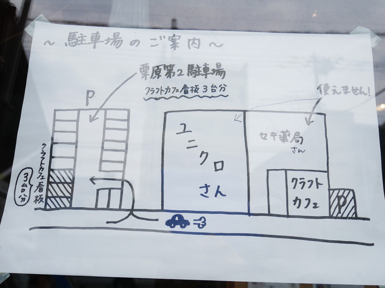 クラフトカフェの駐車場スペースがありますし、無料ですので専用駐車場を利用しましょう