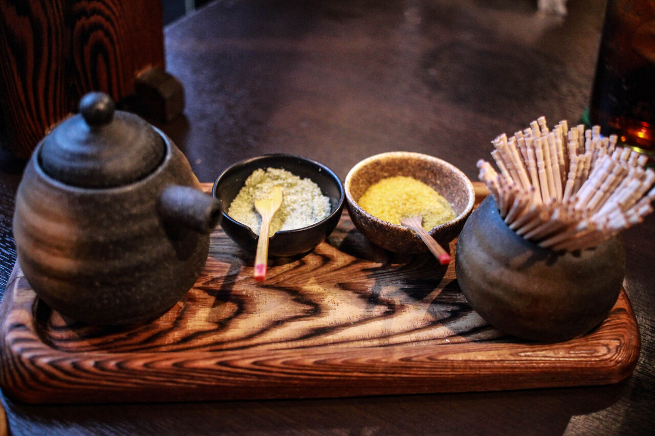 それぞれ、「ソース」「昆布塩」「カレー塩」で食べるのがおすすめ!という意味。