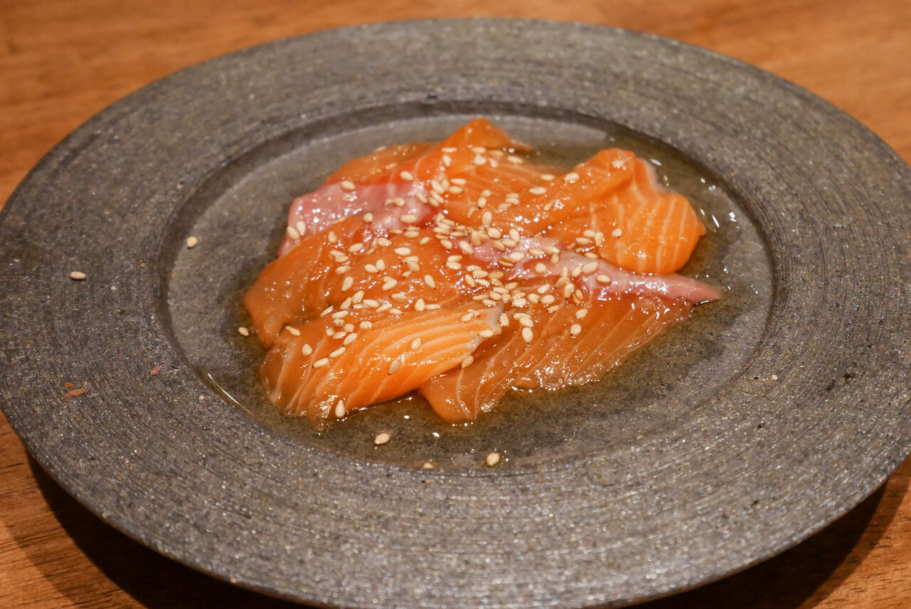 サーモンをごま油で和えたメニュー。