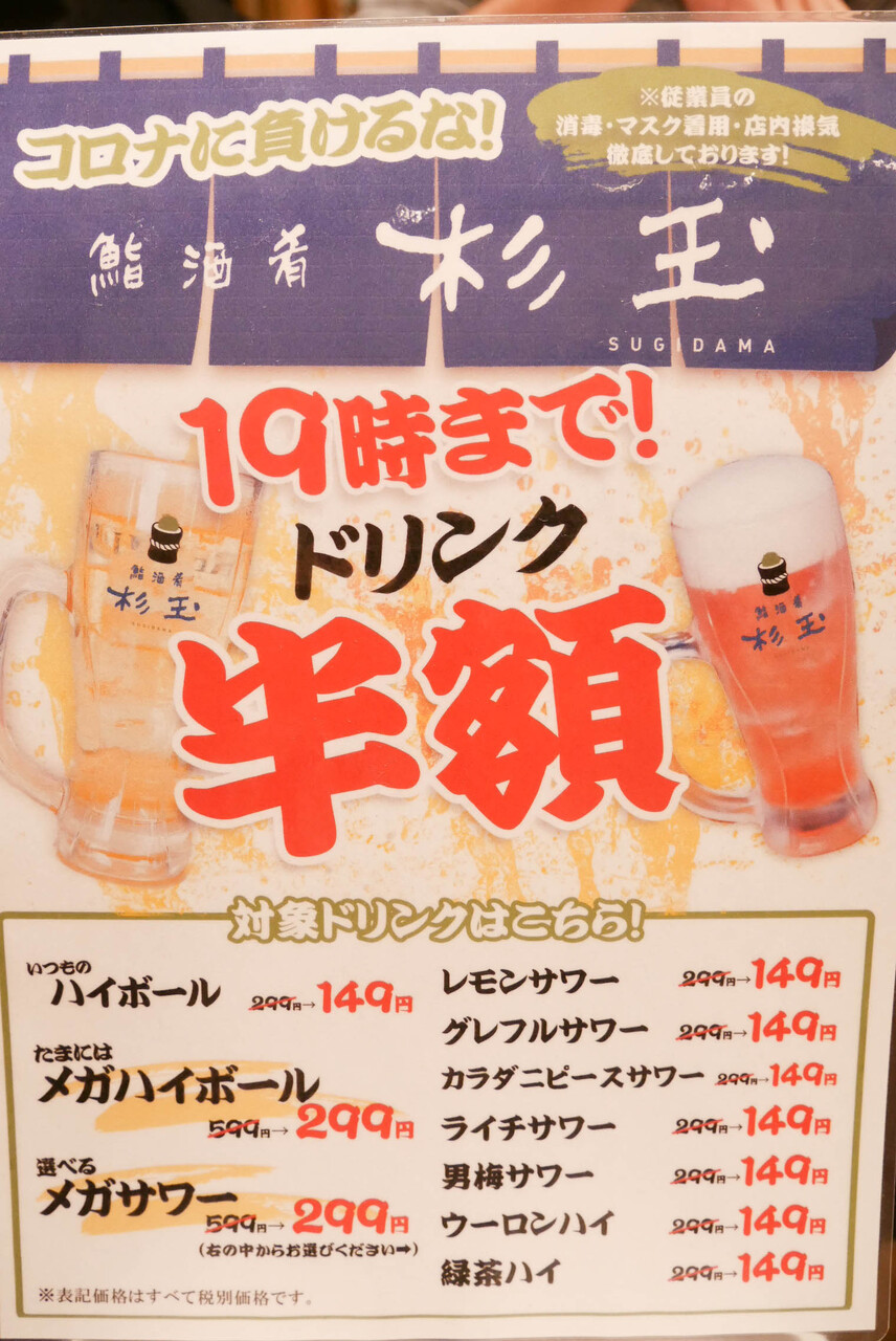今回行ってみたら19時までドリンク半額でした。