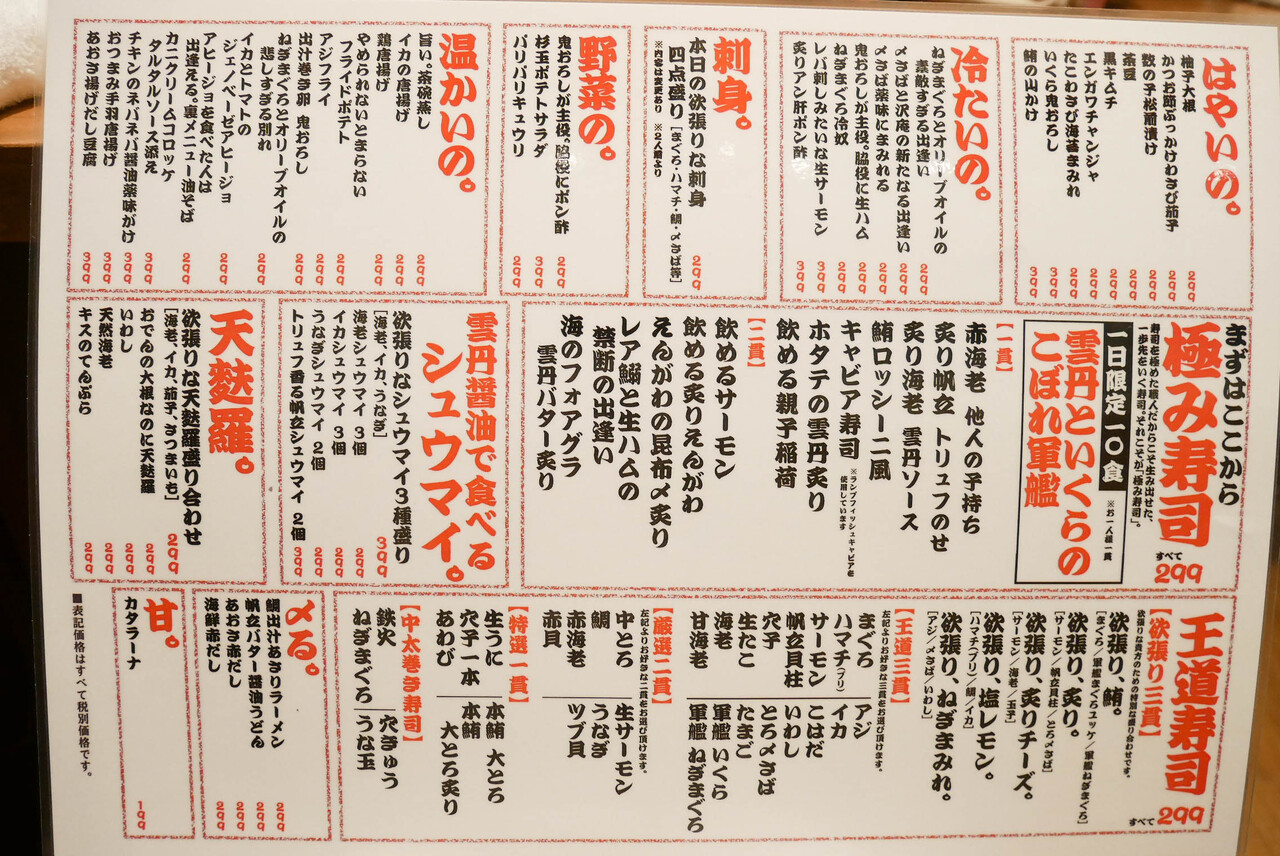 ほとんどのお寿司が299円!コスパよくお寿司とお酒を楽しめるお店です。