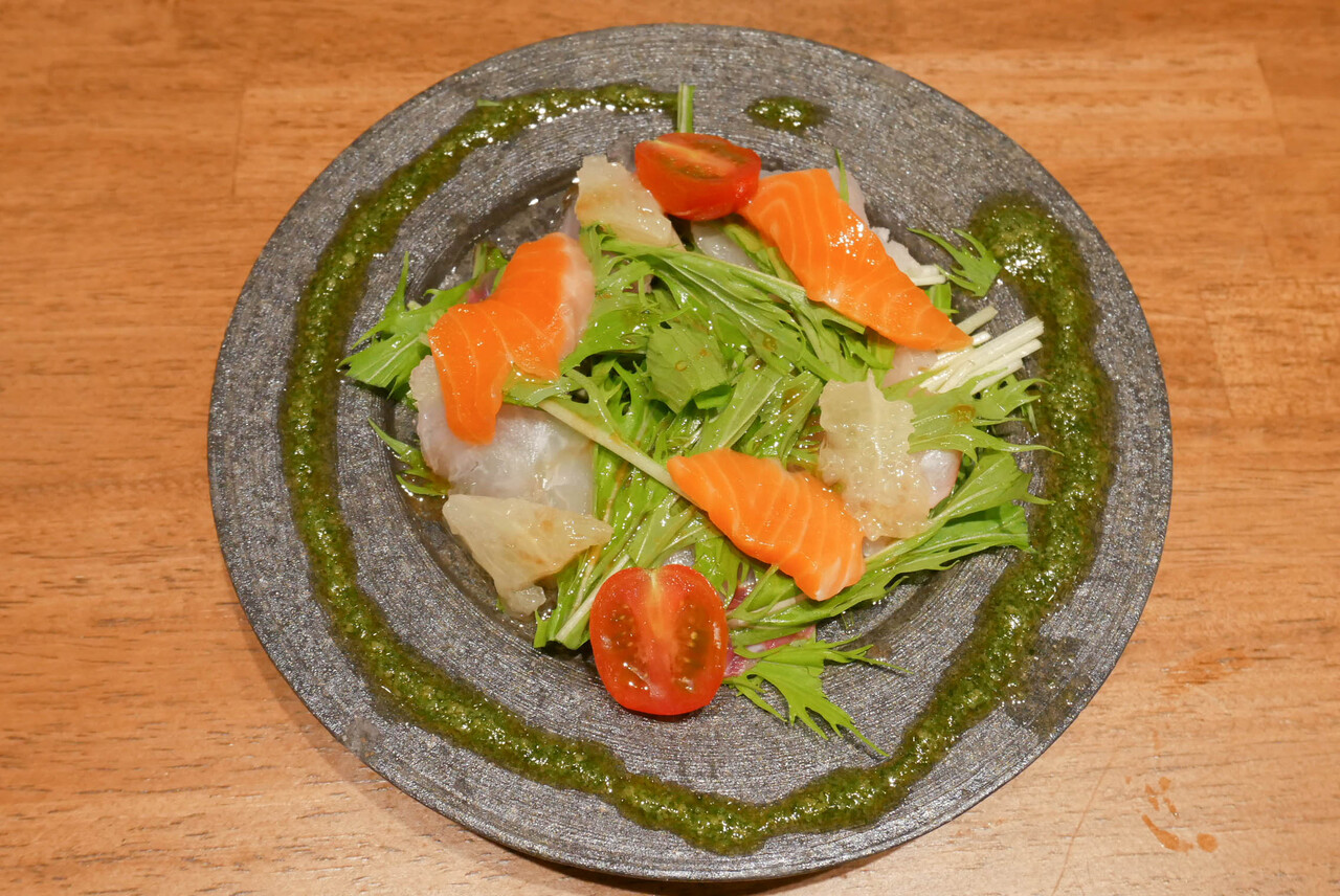 カルパッチョはサーモン、真鯛などのお刺身とプチトマト、水菜、グレープフルーツなどで構成。