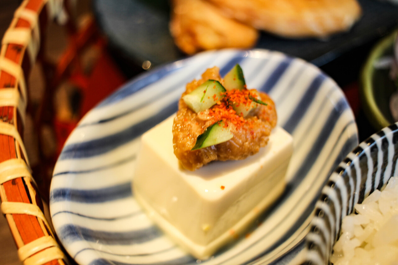 肉味噌豆腐はきゅうりをトッピングにさっぱりと。