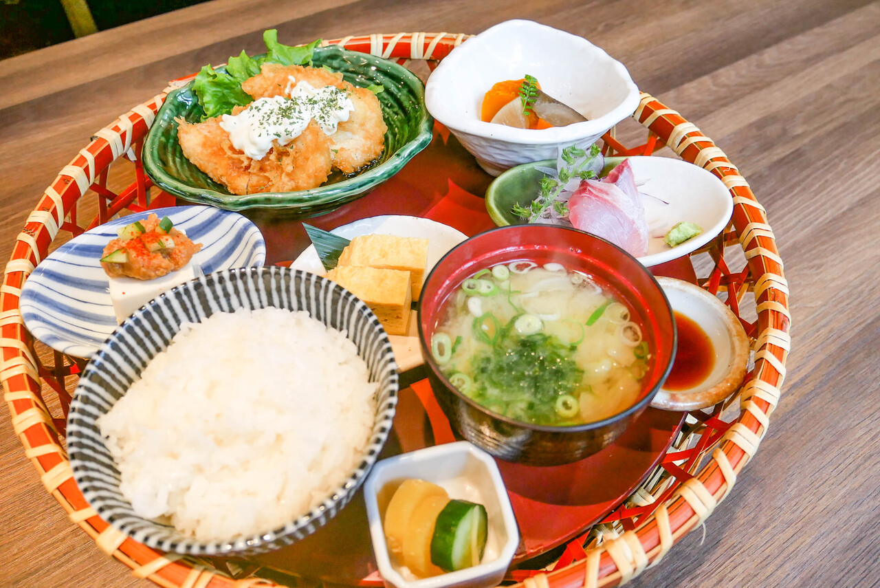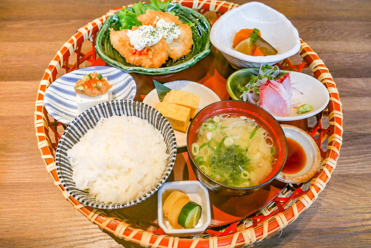 メイン1品、お刺身、煮物、小鉢2品、ごはん、味噌汁、香の物、デザートのセットです。