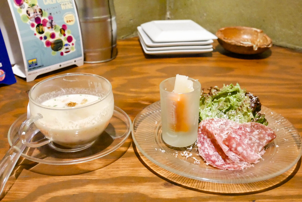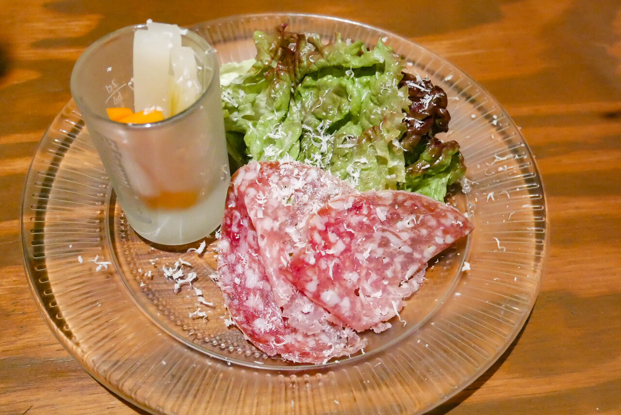 サラダはサラミ2枚、サニーレタス、にんじん、大根、セロリのピクルスでした。