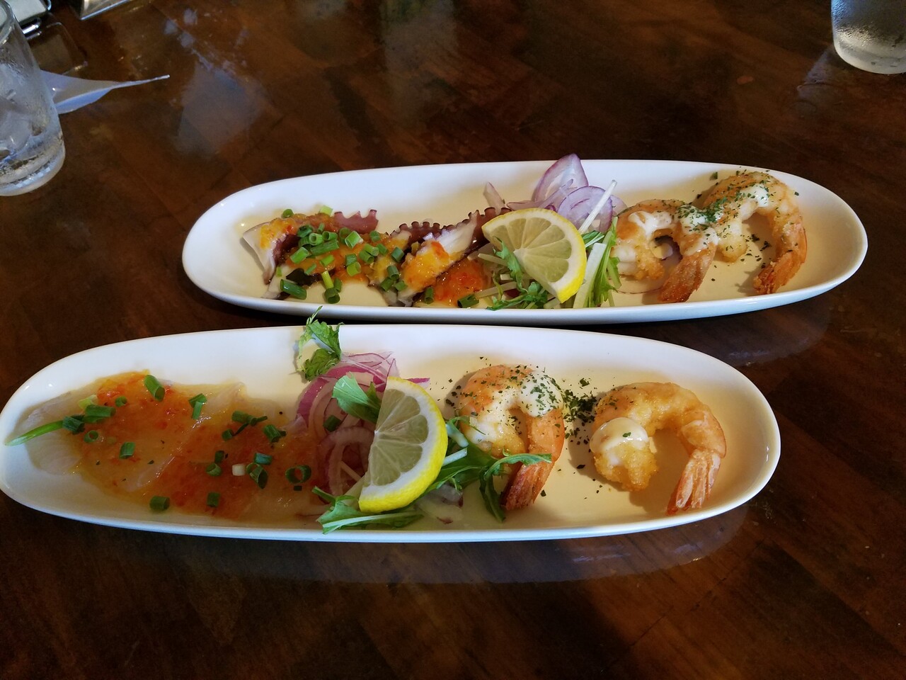 上が奥さんの頼んだ「海老の唐揚げ+タコのカルパッチョ」。