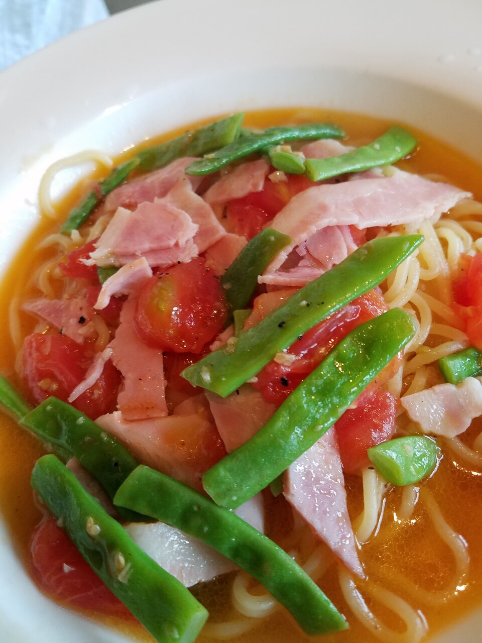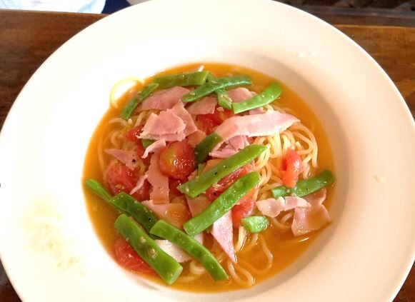 「ベーコン、インゲン、トマトのパスタ」。そのまんまのネーミングやんけ。