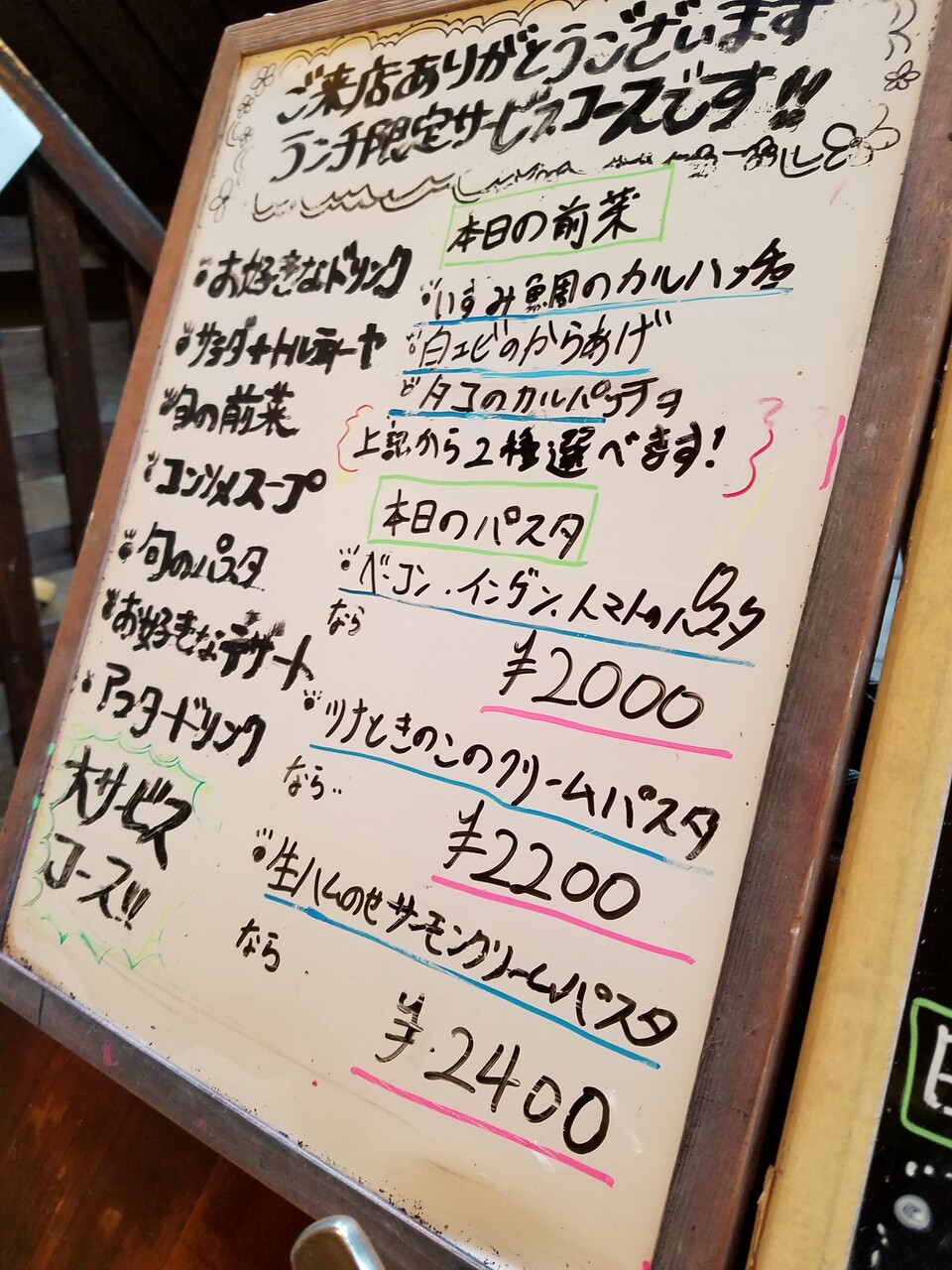 「ドリンク」+「前菜2品」+「サラダ+トルティーヤ」+「スープ」+「旬のパスタ」+「デザート」+「アフタードリンク」で2,000円。