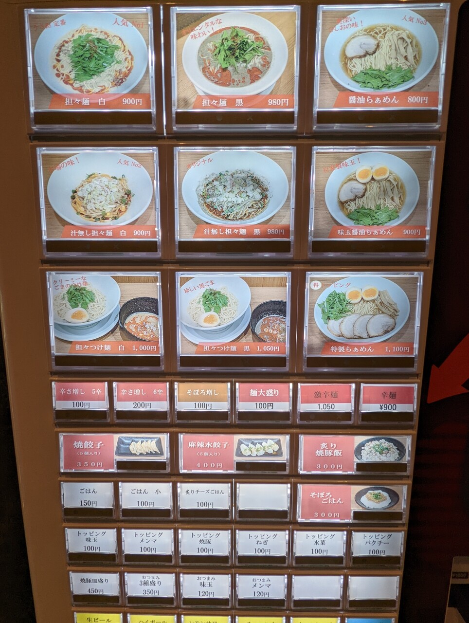 汁あり汁なしそれぞれ白黒あるのは西口の甲州屋別邸と同じですが、こちらは非辛の醤油らぁめんや担々つけ麺も。