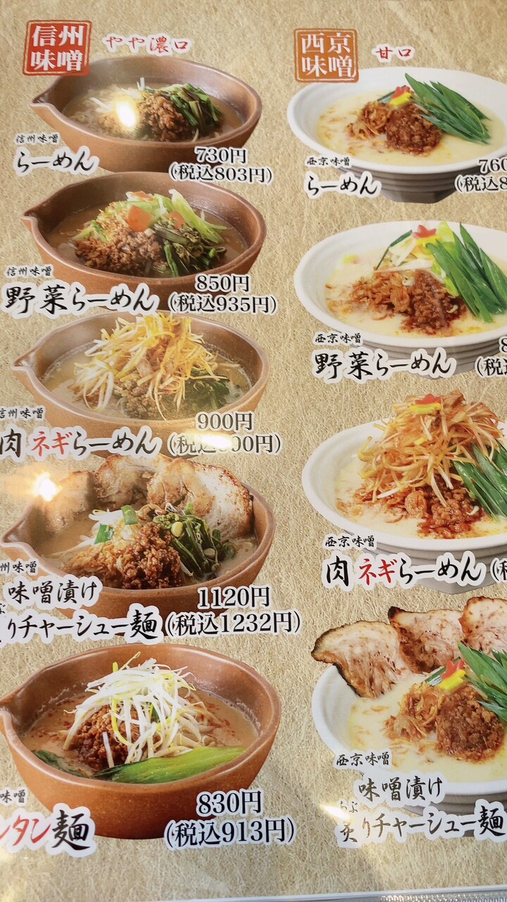 メニューは北海道味噌(濃厚)、信州味噌(やや濃口)、西京味噌(甘口)の三種類のラーメンから選べます。