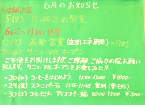 6/5(火)・・・18時までの営業