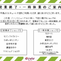 エキュート大宮@ecute_omiya【お知らせ】この度ゾーンリニューアルに伴い、本日9月30日(月)をもって一部スイーツショップが営業終了致します。長きにわたりご愛顧賜りまして誠にありがとうございました。尚、一部ショップでは催事営業を予定しております!詳細は別途… htt ...
