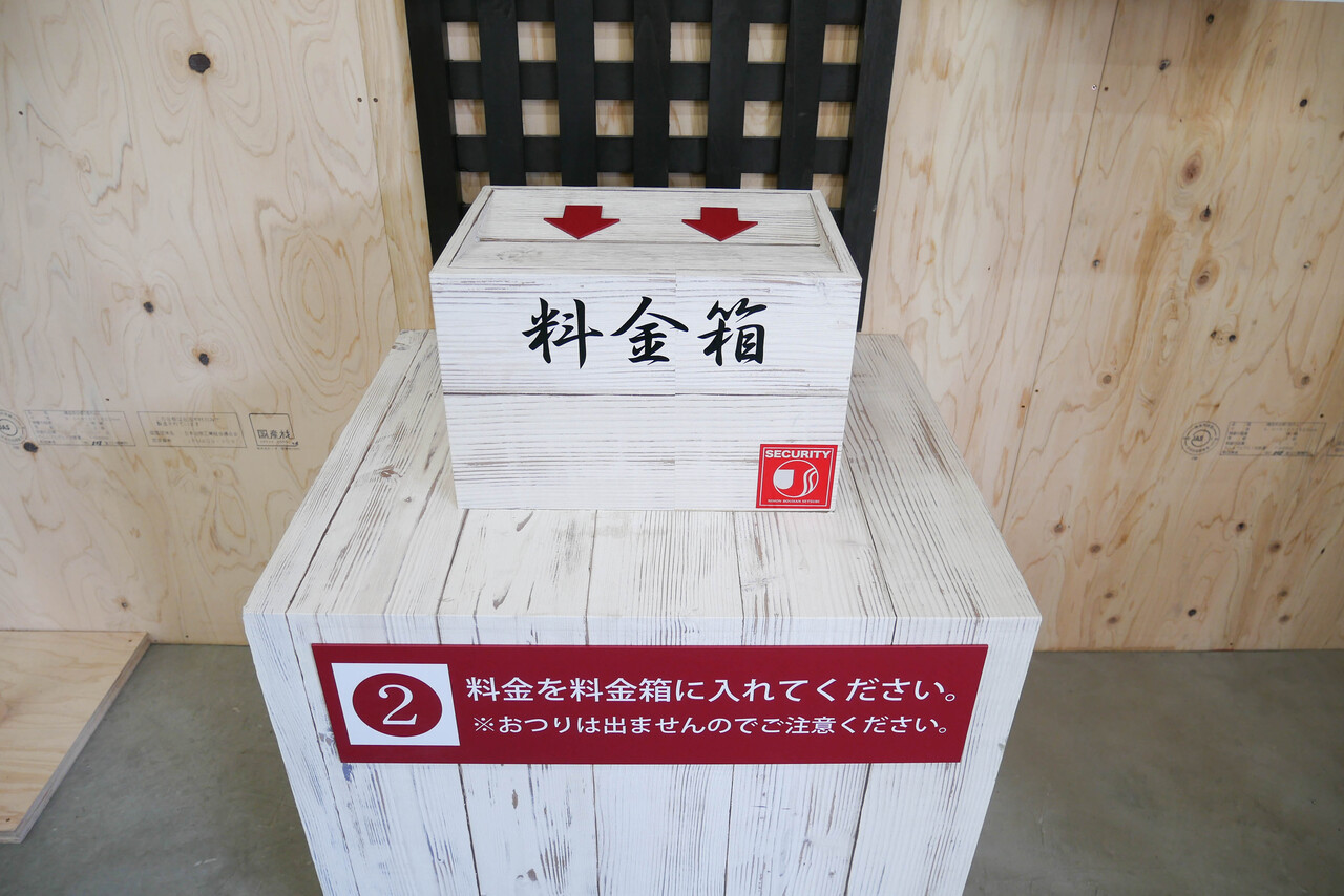 陳列ケースの脇には申し訳程度にお賽銭箱風の料金箱が!